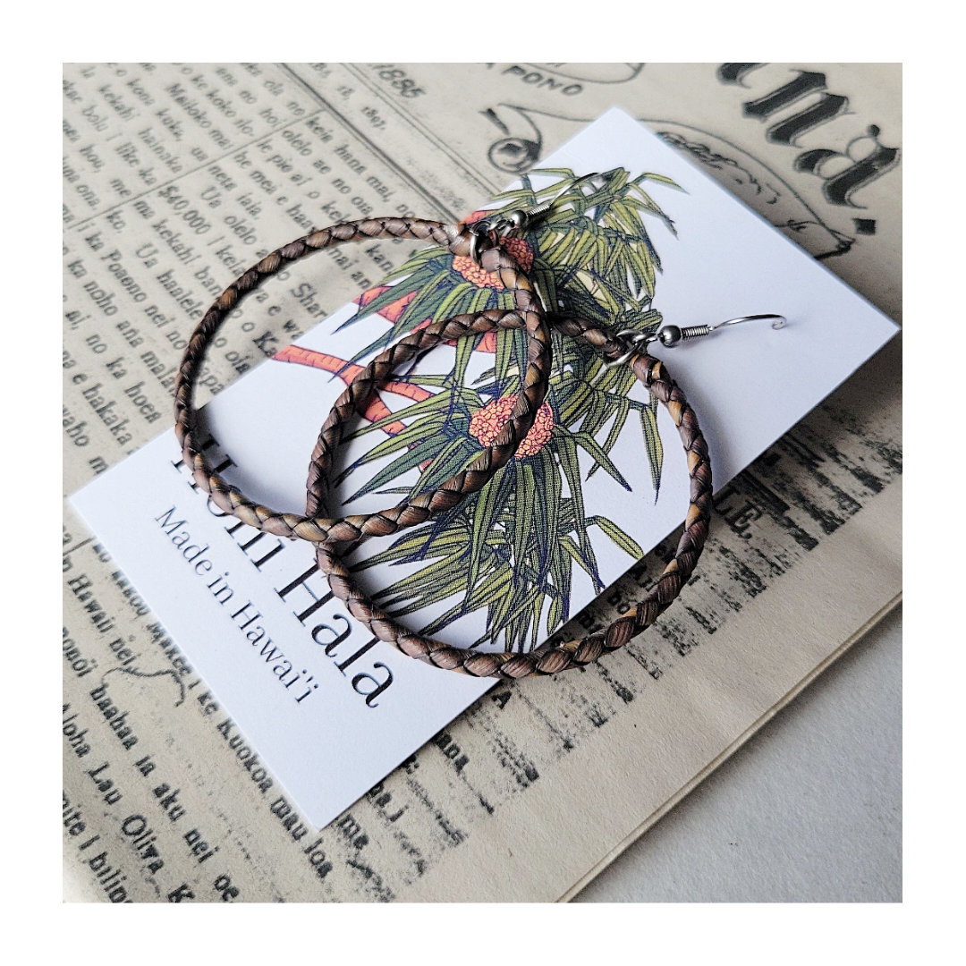 -- Small 2” diameter hoop earrings with all dark brown lauhala weave.